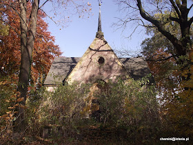Z daleka widać piękne drzewa i zarysy budynku - kaplicy grobowej rodziny von Loesch.
