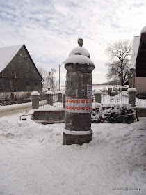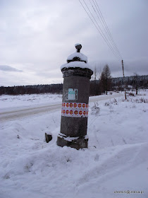3. Słup ogłoszeniowy w pobliżu kościoła, k. budynku nr 31. Cecha charakterystyczna- jakiś dowcipniś nałożył na słup ... oponę :