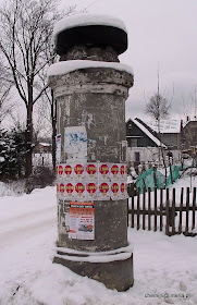 Słupy ogłoszeniowe, a dziwi że brak na nich ogłoszeń. Zwłaszcza że jest co ogłaszać. We wsi są galerie, teatr i wiele innych atrakcji. Przejeżdżając przypadkiem nie sposób dowiedzieć się o nich.